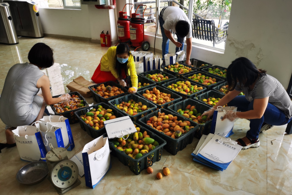 学院工会携手中层干部在这阳光灿烂的日子里到后山芒果园与校园管理部共同采摘,为在这特殊的日子里,希望这抹金黄能够温暖你,给你力量,伴你一起迎来校园相聚的时刻。在校的老师由部门负责人亲自送达,而因疫情影响咱不能返校的老师们,我们依旧通过快递的方式将这些金灿灿的“小太阳”送达你心。
