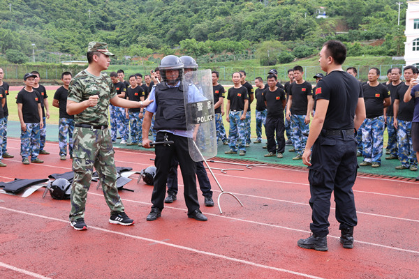 培训活动中,民警通过模拟值勤校园保安在迅速制止有严重暴力倾向的肇事肇祸精神病人、持刀持械人员、极端分子等窜进校园的危急时刻,就防暴钢叉、盾牌等防暴器械在冲突中的操作要领和正确使用上进行了活泼生动而详实逼真的讲解和演示,对于如何用好钢叉和盾牌等防爆器材,毛备密老师上场为大家作示范。“当暴恐分子袭击你时,双手一定要握紧钢叉,利用钢叉的优势,对准暴恐份子的腰部快速有力地将其控制住!两边手持盾牌的安保人员要保护好自己的同时利用盾牌阻挡暴恐份子的进攻”毛备密老师边讲解边挥动钢叉演练。