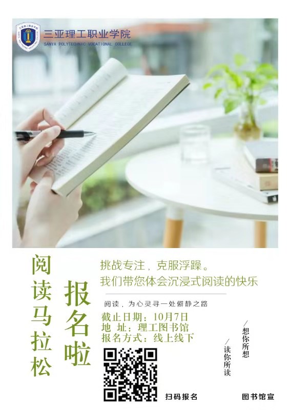 2019/9/26“读万卷书,行万里路”阅读和行走都是充实自己的途径。“阅读马拉松”赋予读书别样的仪式感,让阅读成为我们的一种生活方式。“穿越校园,邂逅文脉”2019年10月8日三亚理工学院图书馆将举行第五届阅读马拉松月挑战赛,将带来一场沉浸式的校园阅读体验。活动...