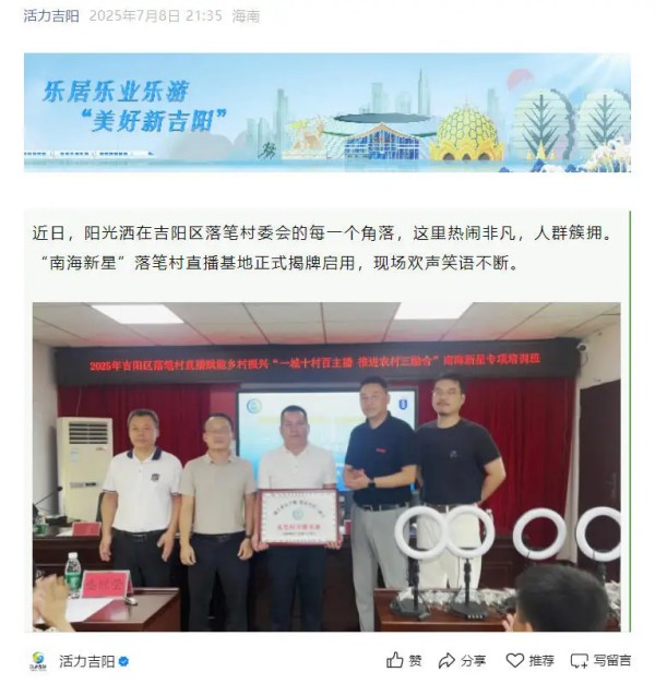 在吉阳区落笔村,阳光与欢笑共同见证了“南海新星直播基地”的诞生。这座承载千年黎族文化的古村落,正以一场“数字革命”打破传统农耕的边界。彩旗飘扬中,32名村民手握手机,从“靠天吃饭”的农人蜕变为“云端带货”的新农人,正如村民蒲贺君所说,“祖传手艺有了新传人,心里踏实有奔头”。落笔大社区以基地为支点,撬动乡村振兴的无限可能,而这背后,离不开落笔村委会与驻村工作队的积极推动,让千年黎村的每一寸土地都跃动着数字经济的脉搏。