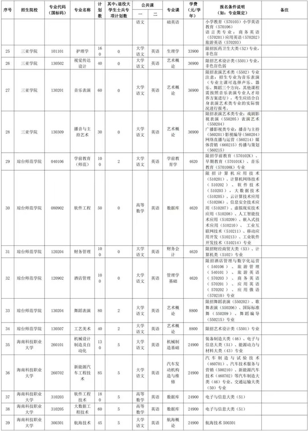 1.2025年海南省专升本招生院校和专业详见附件1,考生(含以下报考两个专项计划的考生)须选择报考符合院校要求报考条件的专业。