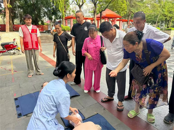 现场气氛热烈,志愿者们一边在人体模型上示范,周围居民驻足学习急救知识,不少居民还主动参与,健康的种子此刻在悄悄发芽。