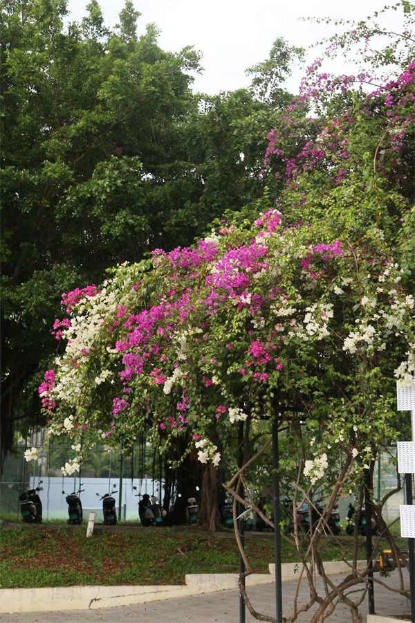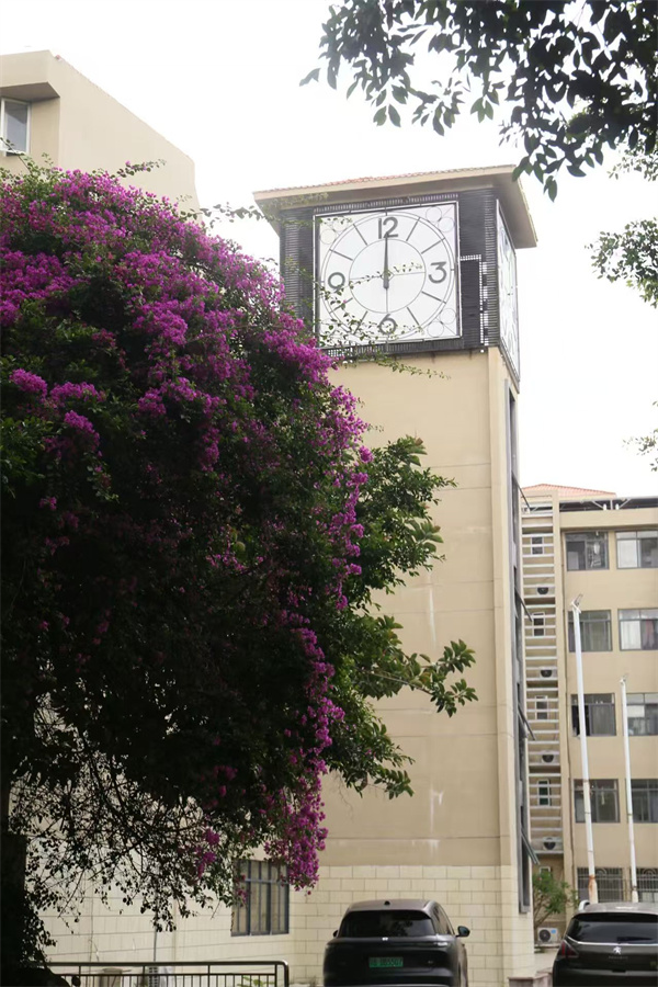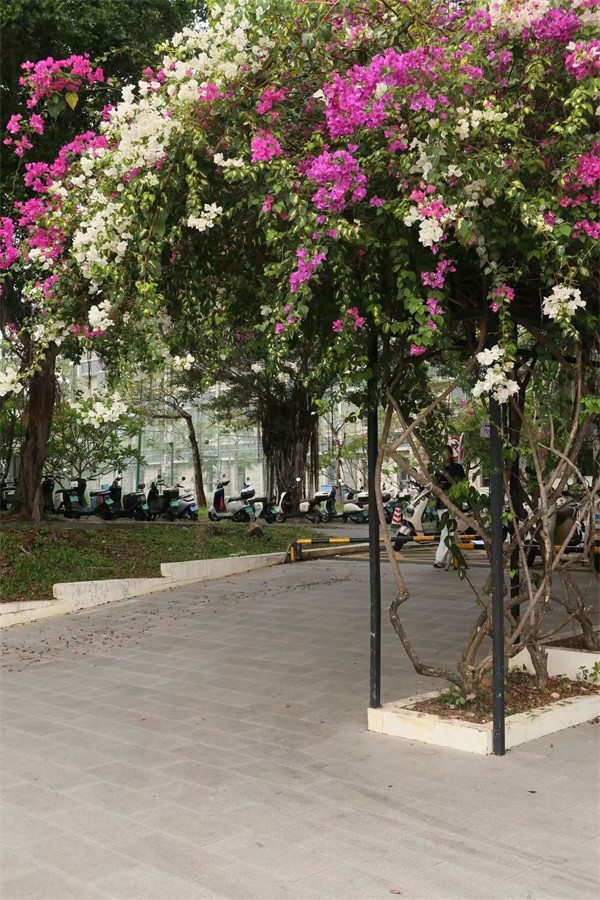 在校园的时光,总是这般惬意又充满活力。三角梅肆意绽放,粉白与玫红交织,装点着校园的角落。钟楼静静伫立,见证着岁月流转。道路两旁,电动车有序停放,那是日常出行的便捷伙伴。操场上,同学们步伐轻快,用汗水诠释青春朝气。树荫下,行人或漫步、或驻足,享受着这份宁静与美好。校园里的每一帧,都写满了青春的诗行。