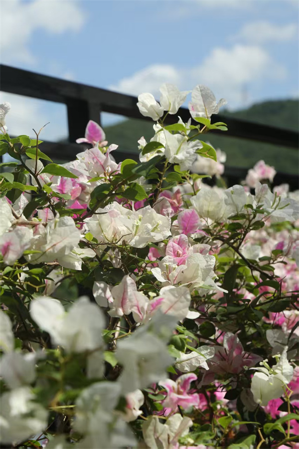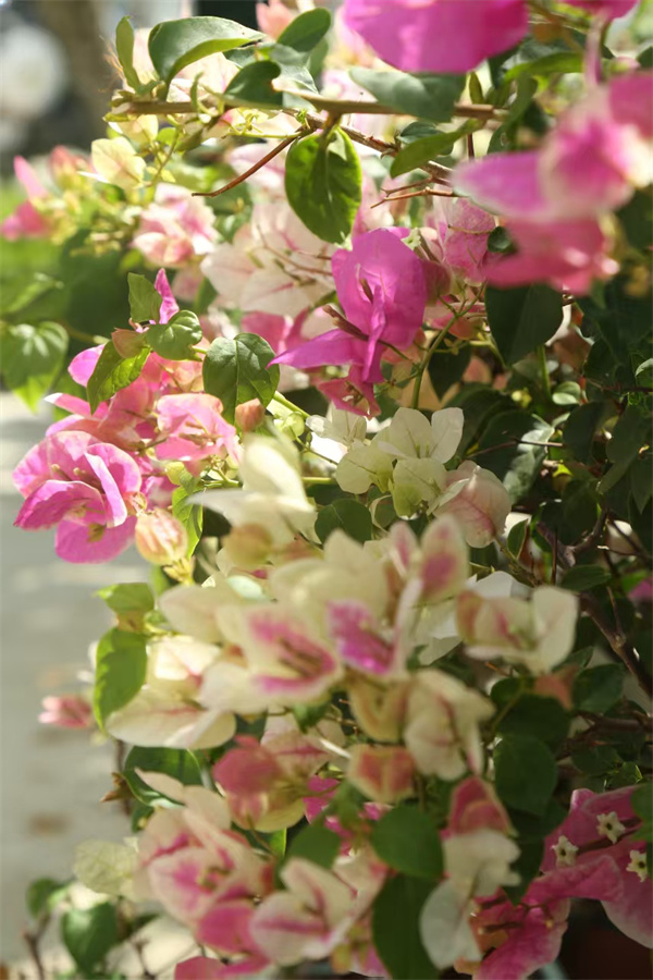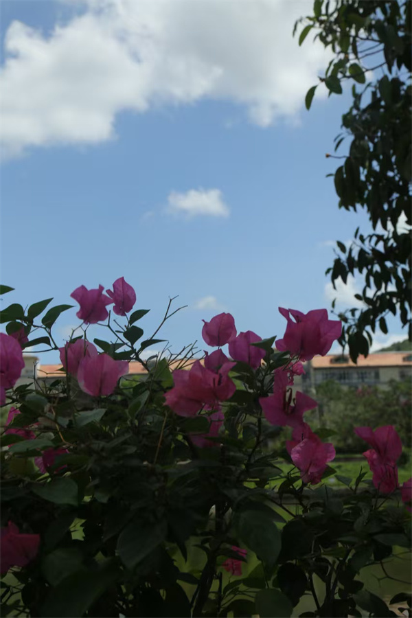 三角梅在枝头肆意绽放,粉白与玫红交织,似是大自然打翻的调色盘。蓝天白云下,繁茂枝叶间,花朵娇艳欲滴。远处建筑静立,湖水悠悠,绿树环绕。这一方天地,满是生机与诗意,每一眼,都能邂逅自然的温柔与美好。