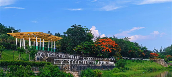 在这方天地,蓝天与白云缠绵,湖水如镜,揽尽青山、建筑与繁花。鸡蛋花绽露温柔,凤凰木燃烧炽热,小径蜿蜒,串联起亭台与葱郁。每一眼都是自然与人文的和鸣,漫步其间,喧嚣远遁,心浸在这宁静又鲜活的画里,不愿醒。