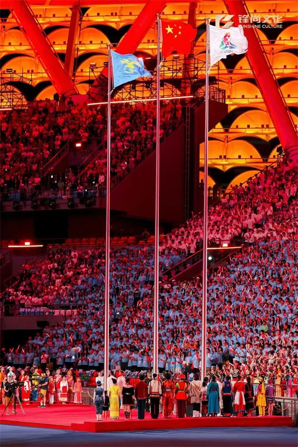 入场仪式完毕,全场起立,高唱中华人民共和国国歌,五星红旗冉冉升起、迎风飘扬。