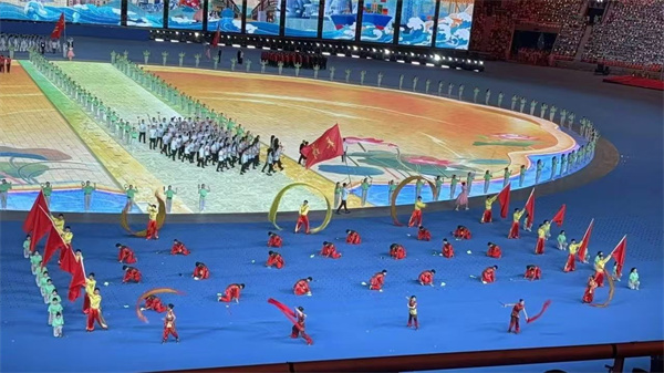 运动会开幕式是一场视觉盛宴,每一处细节都令人振奋,尤其是全场高唱国歌,以及迎接各代表队的运动健儿!国家的强大让我作为一名中国人倍感自豪。作为一名观众,也作为一名高校思政工作者,我深感责任重大。以此次家门口的运动会为契机,要带领大学生青年锐意进取、顽强拼搏,学习运动员永不言败的体育精神,把爱国之志变成报国之行。