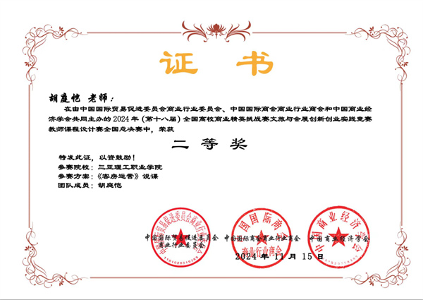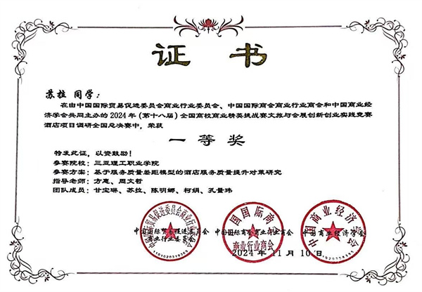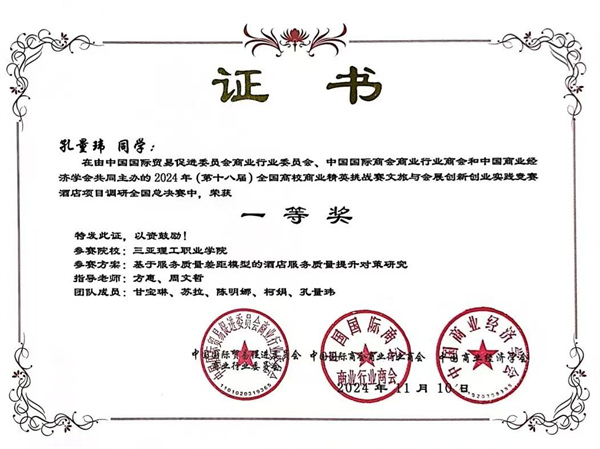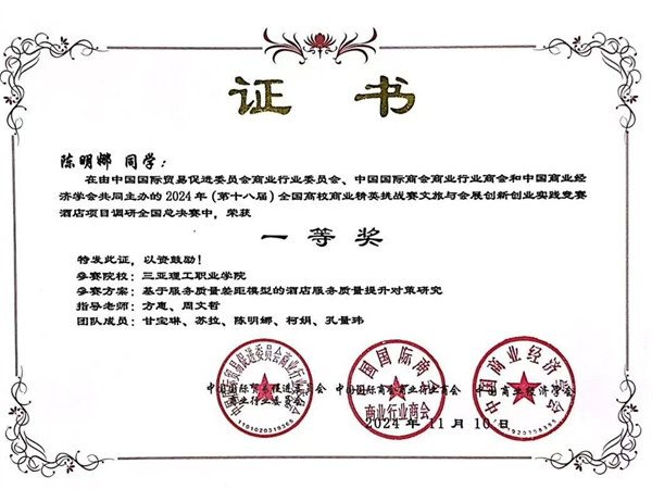 在学生组全国总决赛中,学校代表队捷报频传,荣获一等奖、二等奖和三等奖各一项。在酒店项目调研赛道,通过深入调研和分析,参赛学生充分展示了他们对酒店行业的深刻理解和创新思维,赢得了评委的高度赞誉。