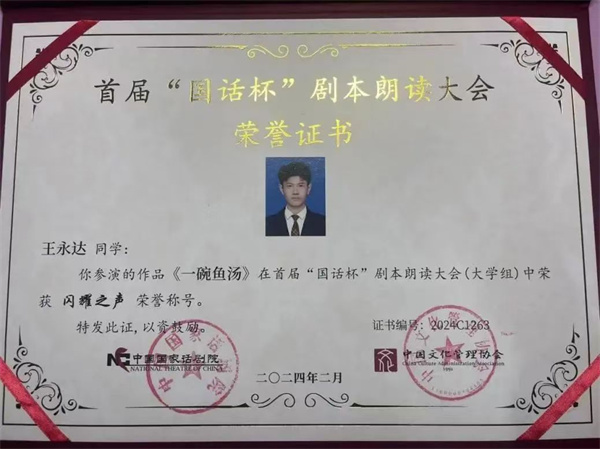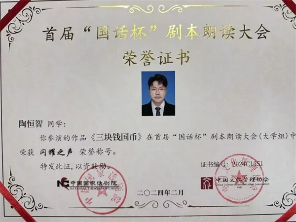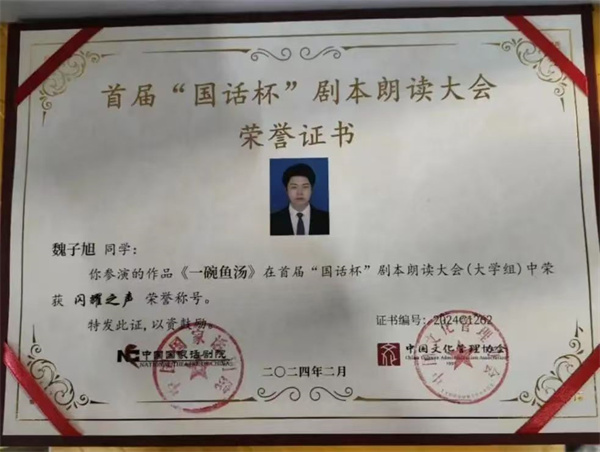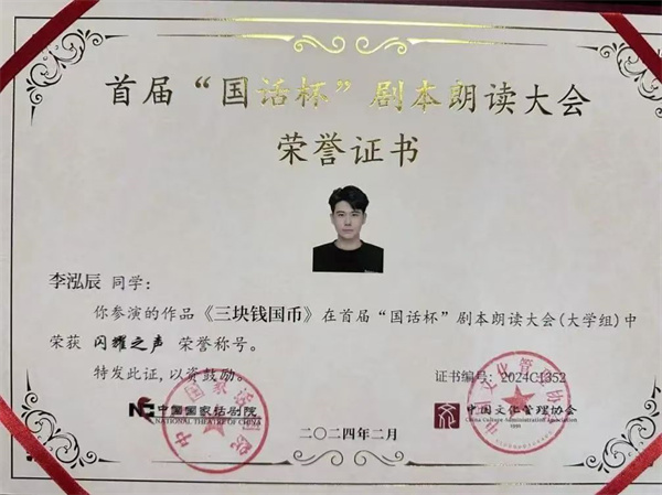 在第一届“国话杯”剧本朗读大赛中,理工学子同样也取得了非常优异的成绩,数字媒体学院表演221班学生董睿祺、表演231班学生李泓辰和陶恒智,凭借作品《三块钱国币》展现出精湛的演技和对剧本深刻的理解;播音231班学生魏子旭、王永达带来的《一碗鱼汤》,以细腻的情感传递打动了在场的每一个人 。最终,五名学生荣获了第一届“国话杯”剧本朗读大赛“闪耀之声”奖。