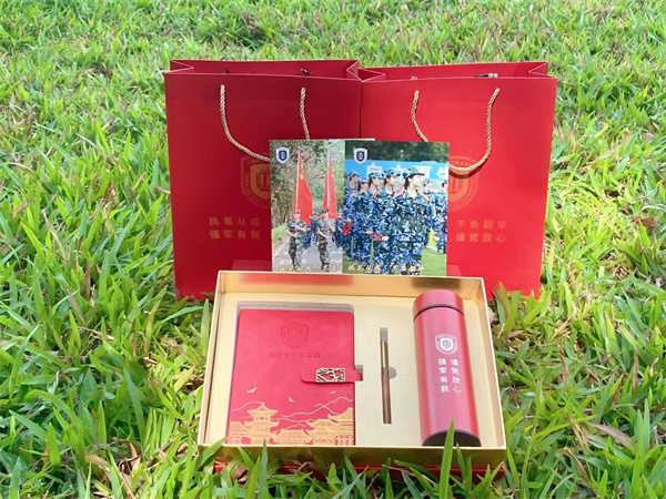 强军礼盒:定制笔记本的封面上印着校徽和热血青春献国防的寄语,定制的圆珠笔笔帽上刻着为人民服务的寄语,还有定制的数显保温杯,上面印刻着“强军有我,请党放心”的寄语。
