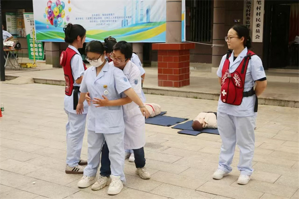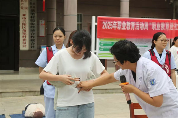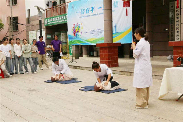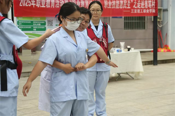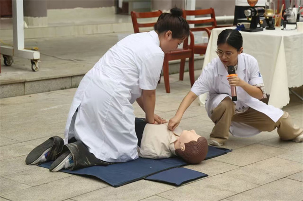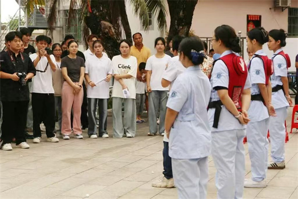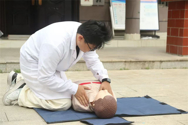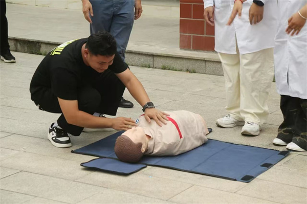 旅游与康体产业学院的急救技能展示区围满了认真学习的居民。师生们通过模拟教具演示心肺复苏(CPR)、海姆立克急救法等实用技能,详细讲解操作要点和黄金救援时间。“按压频率要保持每分钟 100-120 次”“打开气道时需使下颌角与耳垂连线垂直地面”…… 在师生指导下,多位居民上台实操练习,现场形成“人人学急救、急救为人人” 的浓厚氛围。