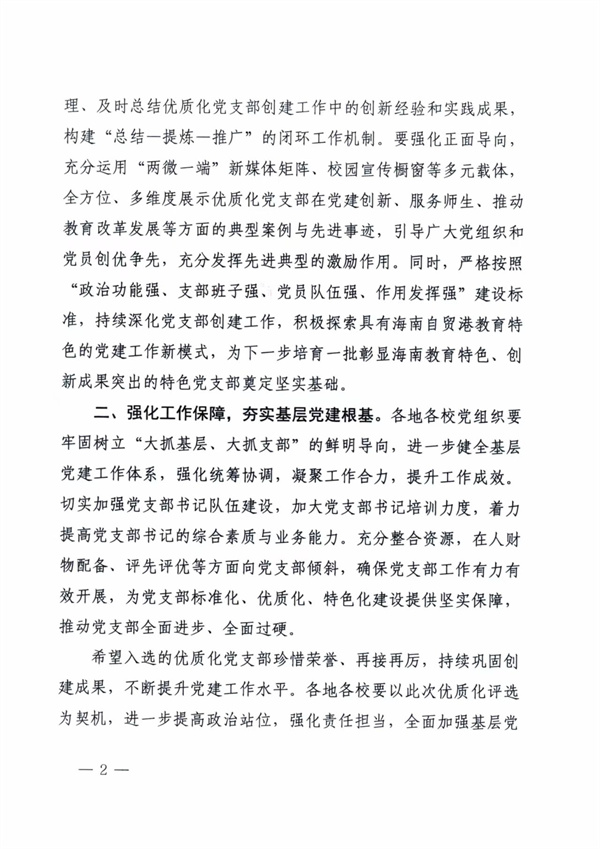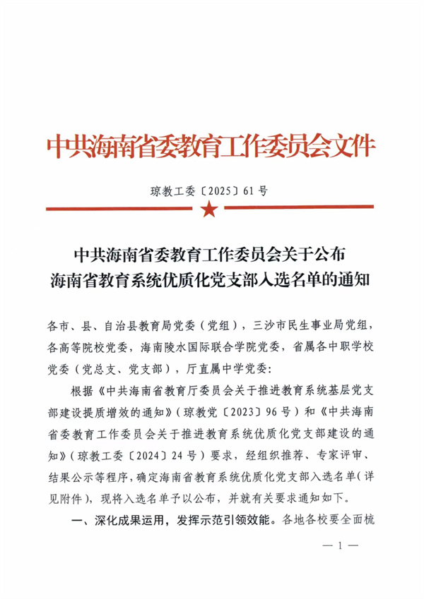 此次评选严格遵循《中共海南省委教育工作委员会关于推进教育系统优质化党支部建设的通知》(琼教工委〔2024〕24 号)要求,历经组织推荐、专家评审和结果公示等严谨程序。入选党支部需全面达到 “政治功能强、支部班子强、党员队伍强、作用发挥强” 的建设标准,并在服务师生、推动教育改革创新等方面取得显著成效,充分展现党支部的凝聚力和战斗力。